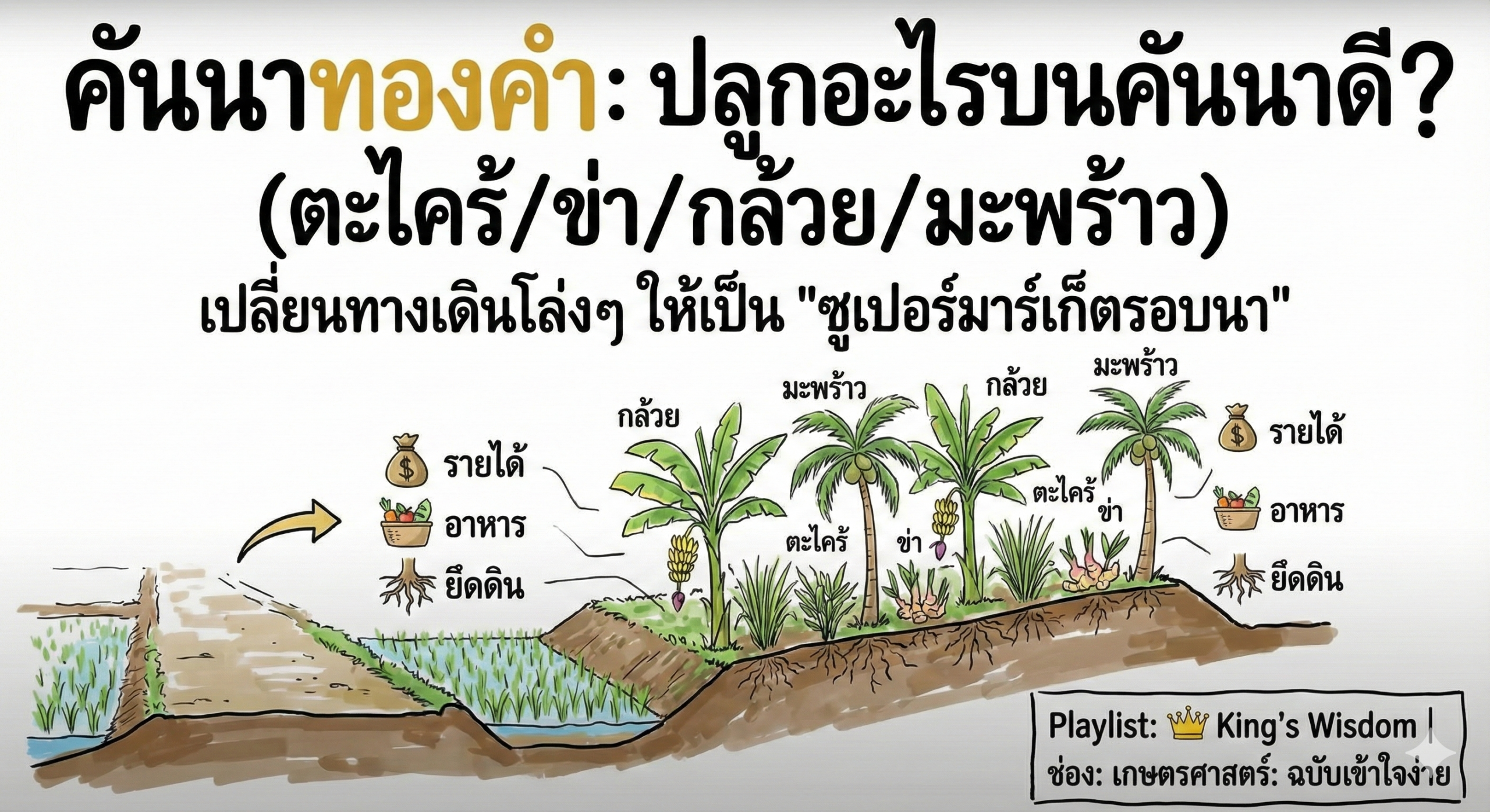 คันนาทองคำ: ปลูกอะไรบนคันนาดี? (ตะไคร้/ข่า/กล้วย/มะพร้าว) เปลี่ยนทางเดินโล่งๆ ให้เป็น “ซูเปอร์มาร์เก็ตรอบนา”