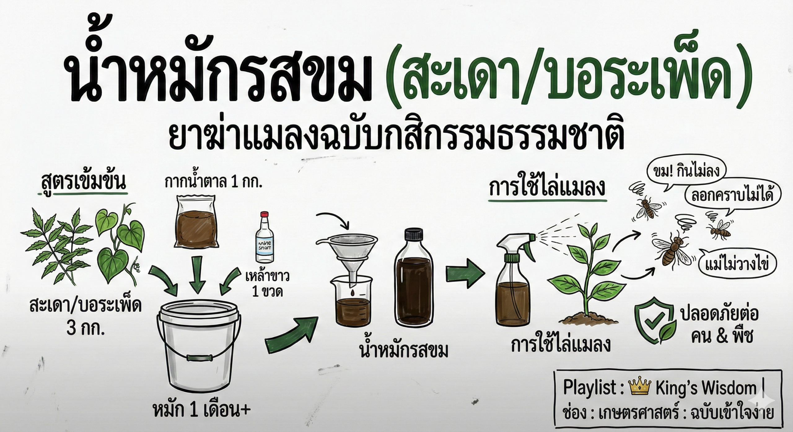 ข้อสำคัญ: น้ำหมักสูตรนี้เข้มข้นมาก และเป็น “สารไล่/ป้องกัน” ไม่ใช่ “สารน็อค” ฉีดปุ๊บตายปั๊บ ต้องใช้เวลาและความสม่ำเสมอครับ