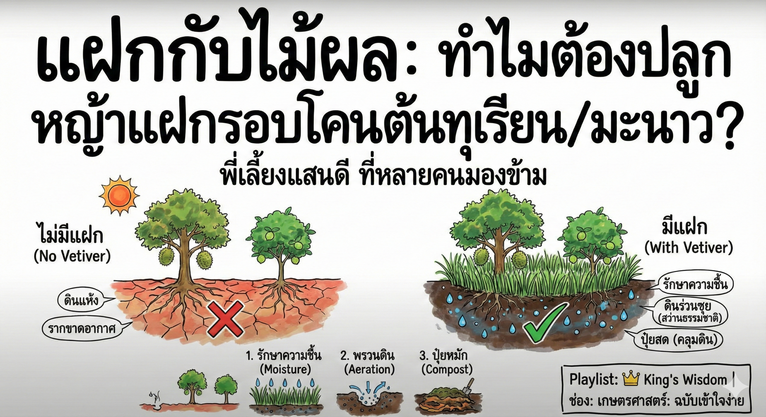 ทำไมเขาถึงทำอย่างนั้น? เขาไม่กลัวแฝกแย่งอาหารเหรอ? วันนี้ช่องเกษตรศาสตร์ฯ จะพาไปไขความลับของ “หญ้าปาฏิหาริย์” ตามแนวพระราชดำริ ที่ไม่ได้มีดีแค่กันดินถล่ม แต่ยังเป็น “สุดยอดพี่เลี้ยง” ของไม้ผลอีกด้วยครับ!